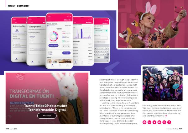 TUENTI ECUADOR accomplishments through the pandemic was being able to quickly coordinate and transfer all of our customer service staff out of the office and into their homes . As the global crisis comes to an end , we are certain that we will not fully transition back to our office spaces , but rather follow in the footsteps of leading innovative companies with a work from anywhere model .”