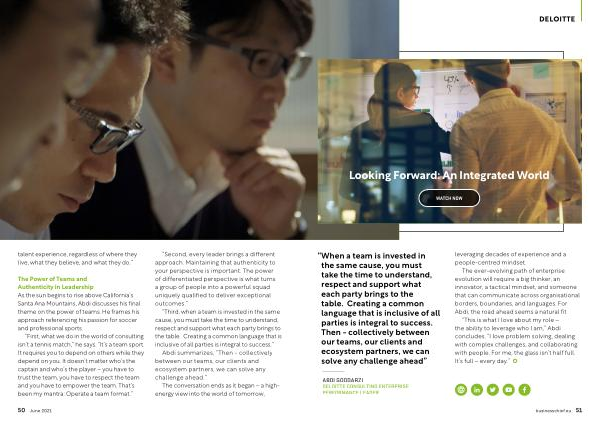 The Power of Teams and Authenticity in Leadership As the sun begins to rise above California ’ s Santa Ana Mountains , Abdi discusses his final theme on the power of teams . He frames his approach referencing his passion for soccer and professional sports .