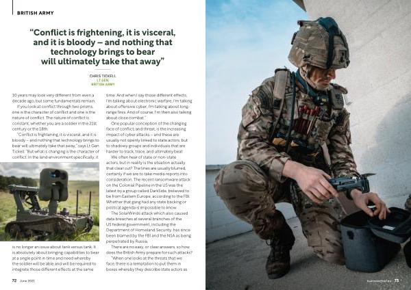 “ Conflict is frightening , it is visceral , and it is bloody – and nothing that technology brings to bear will ultimately take that away ,” says Lt Gen Tickell . “ But what is changing is the character of conflict . In the land environment specifically , it