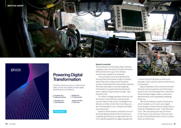“ We are building an open architecture , which enables us to inject new digital technologies , predominantly applications , artificial intelligence tools ,” says Maj Gen Cole . “ We are paving the way for those in the future , but we have to do the hard yards of the backend work , which is about open architectures . businesschief . eu 91