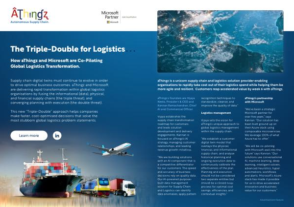 Supply chain digital twins must continue to evolve in order to drive optimal business outcomes . aThingz and Microsoft are delivering rapid transformation within global logistics organisations by fusing the informational ( data ), physical , and financial supply chains ( the triple threat ), and converging planning with execution ( the double threat ).