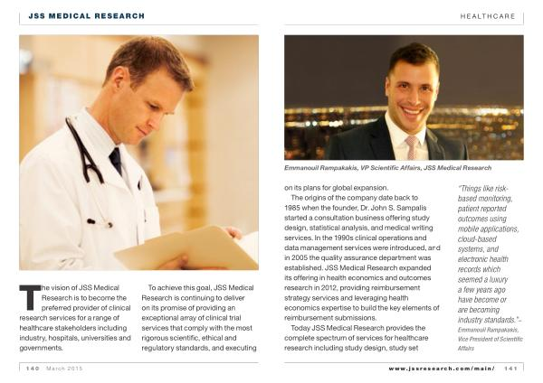 on its plans for global expansion . The origins of the company date back to 1985 when the founder , Dr . John S . Sampalis started a consultation business offering study design , statistical analysis , and medical writing services . In the 1990s clinical operations and data management services were introduced , and in 2005 the quality assurance department was established . JSS Medical Research expanded its offering in health economics and outcomes research in 2012 , providing reimbursement strategy services and leveraging health economics expertise to build the key elements of reimbursement submissions .