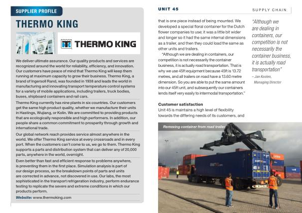 SUPPLY CHAIN that is one piece instead of being mounted . We developed a special floral container for the Dutch flower companies to use ; it was a little bit wider and longer so it had the same internal dimensions as a trailer , and then they could load the same as other units and trailers .