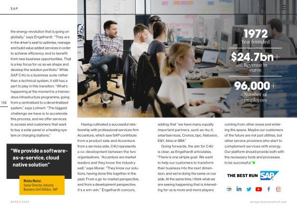 136 the energy revolution that is going on globally ,” says Engelhardt . “ They are in the driver ’ s seat to optimise , manage and build value added services in order to achieve efficiency and to benefit from new business opportunities . That is a key focus for us as we shape and develop the solution portfolio .” While SAP C4U is a business suite rather than a technical system , it still has a part to play in this transition . “ What ’ s happening at the moment is a tremendous infrastructure programme , going from a centralised to a decentralised system ,” says Lohnert . “ The biggest challenge we have is to accelerate this process , and we offer services to access end customers that want to buy a solar panel or a heating system or charging stations .”