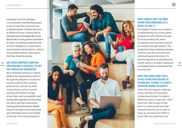 emerging real-time dialogue communication tools that they expect to see in both their personal and professional lives . Another key focus at Wolters Kluwer is being able to leverage new technologies like AI and Blockchain to drive greater automation for Gen Z , as well as provide the tools and the intelligence to assist them by proactively raising actions , options and possible advisory discussions that they should be having .