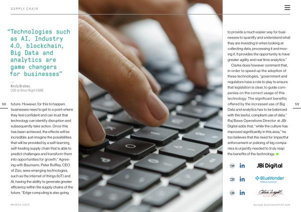 58 future . However , for this to happen , businesses need to get to a point where they feel confident and can trust that technology can identify disruption and subsequently take action . Once this has been achieved , the effects will be incredible : just imagine the possibilities that will be provided by a self-learning , self-healing supply chain that is able to predict challenges and transform them into opportunities for growth .” Agreeing with Baumann , Peter Ruffley , CEO of Zizo , sees emerging technologies , such as the internet of things ( IoT ) and AI , having the ability to generate greater efficiency within the supply chains of the future . “ Edge computing is also going