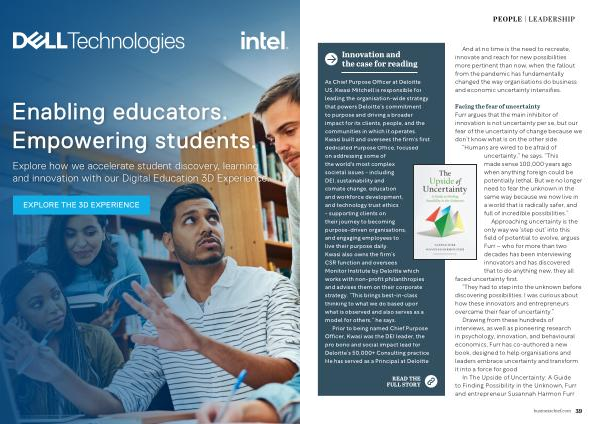 As Chief Purpose Officer at Deloitte US , Kwasi Mitchell is responsible for leading the organisation-wide strategy that powers Deloitte ’ s commitment to purpose and driving a broader impact for its clients , people , and the communities in which it operates . Kwasi built and oversees the firm ' s first dedicated Purpose Office , focused on addressing some of the world ' s most complex societal issues - including DEI , sustainability and climate change , education and workforce development , and technology trust ethics - supporting clients on their journey to becoming purpose-driven organisations , and engaging employees to live their purpose daily . Kwasi also owns the firm ’ s CSR function and oversees Monitor Institute by Deloitte which works with non-profit philanthropies and advises them on their corporate strategy . “ This brings best-in-class thinking to what we do based upon what is observed and also serves as a model for others ,” he says .