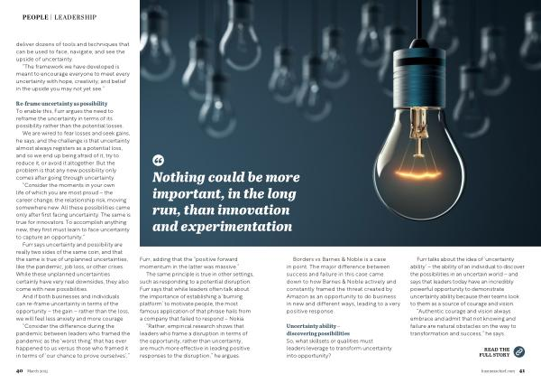Re-frame uncertainty as possibility To enable this , Furr argues the need to reframe the uncertainty in terms of its possibility rather than the potential losses .