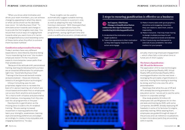 “ Because of this attitude shift , personalised training , learning and development journeys are an essential differentiator for employers right now ,” David tells Business Chief . “ Training in the future will be both mobile and personalised – these are inherently linked to AI and gamification technologies .”