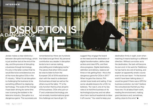 PHIL JORDAN - SAILING CLOSE HAULED suggest they engage the board on the need and the destination of digital transformation , define clear actions and clear KPIs , and then show progress . Digital destination , definition and delivery , balance all three or risk getting fired - this is the dangerous game for CIOs in 2017 .” When he gets the chance , Phil Jordan loves boats and sailing . It has some valuable lessons for a CIO , he believes . “ As I see it , one of my key roles is to hold the business on its technological journey and not allow short term tactical headwinds to blow it off course .” You need to keep your