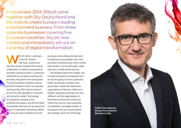 In November 2014 , BSkyB came together with Sky Deutschland and Sky Italia to create Europe ’ s leading entertainment business . From three separate businesses covering five European countries , Sky plc was created and immediately set out on a journey of digital transformation .