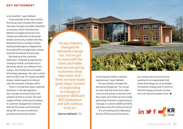 “ As any industry changes the demands change too . You ’ ve got to move with the times and make sure you are giving customers what they need , and I think we have made great steps forward in responding to changes in customer ( B2B and B2C ) behaviour and will continue to do so . “ It is an exciting and challenging time for KR Group and the sector as a whole and I am proud to be working for an organisation that views technology as a true enabler for positive change both in terms of that technology and how we also strive to improve people ’ s lives .” www . krgroup . co . uk 91