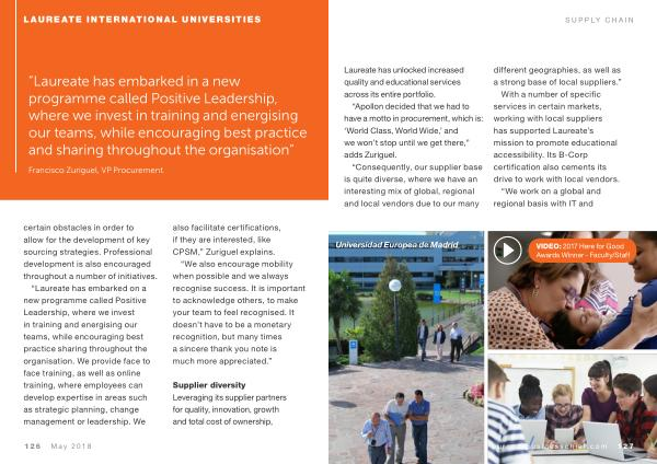 “ Laureate has embarked on a new programme called Positive Leadership , where we invest in training and energising our teams , while encouraging best practice sharing throughout the organisation . We provide face to face training , as well as online training , where employees can develop expertise in areas such as strategic planning , change management or leadership . We also facilitate certifications , if they are interested , like CPSM ,” Zuriguel explains .