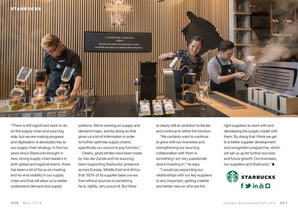 “ I would say expanding our relationships with our key suppliers is very important , getting a better and better view on who are the right suppliers to work with and developing the supply model with them . By doing that I think we get to a better supplier development and recognition programme , which will set us up for further success and future growth : Our licensees , our suppliers and Starbucks .”