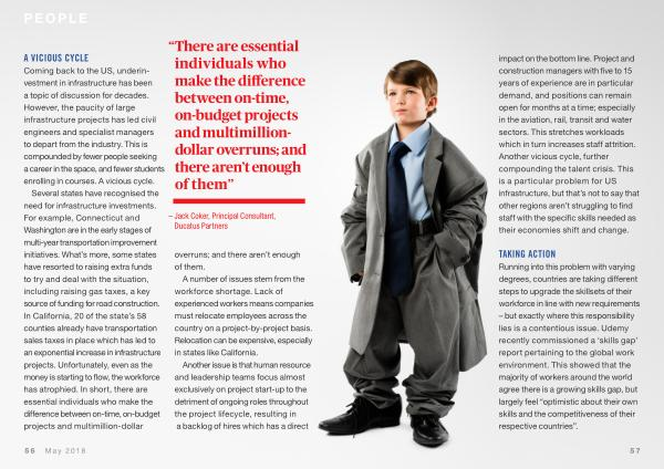 impact on the bottom line . Project and construction managers with five to 15 years of experience are in particular demand , and positions can remain open for months at a time ; especially in the aviation , rail , transit and water sectors . This stretches workloads which in turn increases staff attrition . Another vicious cycle , further compounding the talent crisis . This is a particular problem for US infrastructure , but that ’ s not to say that other regions aren ’ t struggling to find staff with the specific skills needed as their economies shift and change .