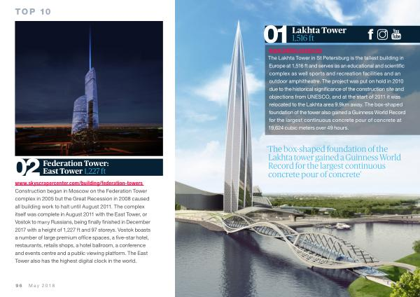 Lakhta Tower 1,516 ft The Lakhta Tower in St Petersburg is the tallest building in Europe at 1,516 ft and serves as an educational and scientific complex as well sports and recreation facilities and an outdoor amphitheatre . The project was put on hold in 2010 due to the historical significance of the construction site and objections from UNESCO , and at the start of 2011 it was relocated to the Lakhta area 9.9km away . The box-shaped foundation of the tower also gained a Guinness World Record for the largest continuous concrete pour of concrete at 19,624 cubic meters over 49 hours .