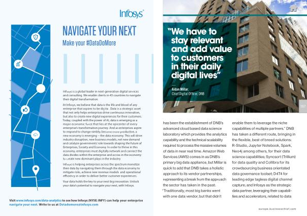 137 has been the establishment of DNB ’ s advanced cloud based data science laboratory which provides the analytics capability and the technical scalability required to process the massive volumes of data in near real time . Amazon Web Services ( AWS ) comes in as DNB ’ s primary big data appliance , but Millar is quick to add that DNB takes a holistic approach to its vendor partnerships , representing a break from the approach the sector has taken in the past : “ Traditionally , most big banks went with one data vendor , but that didn ’ t enable them to leverage the niche capabilities of multiple partners .” DNB has taken a different route , bringing in the flexible , best of breed solutions : R-Studio , Jupyter Notebook , Spark , Neo4j among others , for their data science capabilities ; Syncsort ( Trillium ) for data quality and Collibra for its crowdsourcing business orientated data governance toolset ; D4T4 for leading edge tagless digital channel capture ; and Infosys as the strategic data partner , leveraging their capabilities and accelerators , related to data