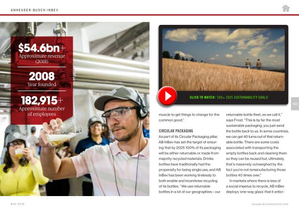 As part of its Circular Packaging pillar , AB InBev has set the target of ensuring that by 2025 100 % of its packaging will be either returnable or made from majority recycled materials . Drinks bottles have traditionally had the propensity for being single use , and AB InBev has been working tirelessly to both enable and incentivise recycling of its bottles . “ We use returnable bottles in a lot of our geographies – our