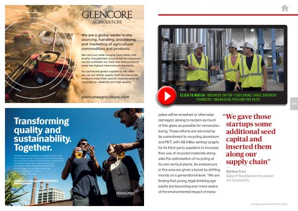 165 pates will be smashed or otherwise damaged , aiming to reclaim as much of this glass as possible for remanufacturing . These efforts are mirrored by its commitment to recycling aluminium and PET , with AB InBev setting targets for its third-party suppliers to increase their use of recycled materials alongside the optimisation of recycling at its own vertical plants . Its endeavours in this area are given a boost by shifting moods on a generational level . “ We are finding that young , legal drinking age adults are becoming ever more aware of the environmental impact of manu-