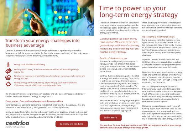 Centrica Business Solutions and CBRE have joined forces in a preferred partnership arrangement to help businesses tackle the four major energy challenges of high costs ; power supply disruption ; operational efficiency , and sustainability .