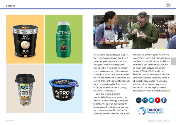 resources to help employees support the firm ’ s vision and goals . But it ’ s not just employees who are an important catalyst of this sustainability drive . Indeed , Faber highlights how consumers are an integral part of this transformation journey and how they ’ ve pushed the firm to better itself . “ Consumers are craving change ,” he says . “ They expect large organisations like Danone to bring our scale of impact to change the world for the better .”