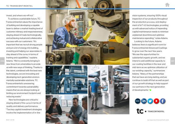 246 invest , and where we will not .” To achieve a sustainable future , TC Transcontinental values the importance of building and developing a capable team to deliver a market-leading level of customer intimacy and responsiveness , staying ahead of rivals technologically , and achieving mutual and collaborative success with our customers . “ It ’ s important that we recruit strong people and put a lot of energy into building , investing and helping our associates to stay ahead of the curve , in terms of training and capabilities ,” explains Adams . “ We ’ re constantly bringing in new hires from universities to provide us with new ways of thinking . Thanks to this talent , combined with the best new technologies , we are innovating and developing next-generation environmentally sustainable solutions . TC Transcontinental ’ s unwavering commitment towards sustainability means that we are always looking at limiting our environment footprint and reducing waste .”
