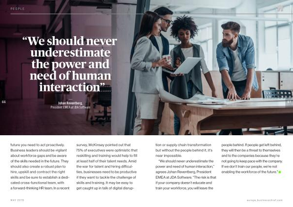 “ We should never underestimate the power and need of human interaction ,” agrees Johan Reventberg , President EMEA at JDA Software . “ The risk is that if your company doesn ’ t educate and train your workforce , you will leave the people behind . If people get left behind , they will then be a threat to themselves and to the companies because they ’ re not going to keep pace with the company . If we don ’ t train our people , we ’ re not enabling the workforce of the future .”