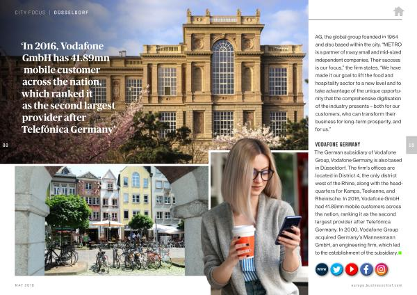 The German subsidiary of Vodafone Group , Vodafone Germany , is also based in Düsseldorf . The firm ’ s offices are located in District 4 , the only district west of the Rhine , along with the headquarters for Kamps , Teekanne , and Rheinische . In 2016 , Vodafone GmbH had 41.89mn mobile customers across the nation , ranking it as the second largest provider after Telefónica Germany . In 2000 , Vodafone Group acquired Germany ’ s Mannesmann GmbH , an engineering firm , which led to the establishment of the subsidiary .