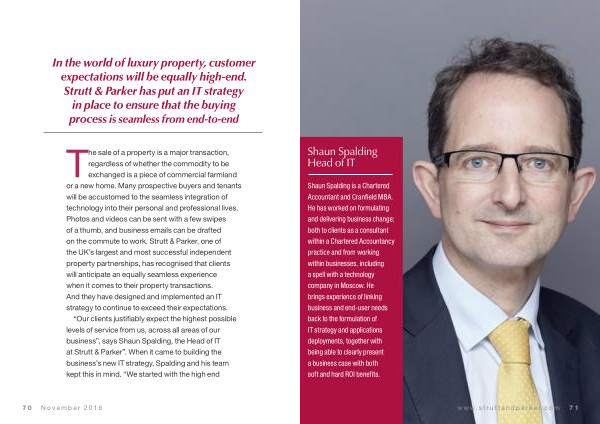Shaun Spalding is a Chartered Accountant and Cranfield MBA . He has worked on formulating and delivering business change ; both to clients as a consultant within a Chartered Accountancy practice and from working within businesses , including a spell with a technology company in Moscow . He brings experience of linking business and end-user needs back to the formulation of IT strategy and applications deployments , together with being able to clearly present a business case with both soft and hard ROI benefits . www . struttandparker . com 71