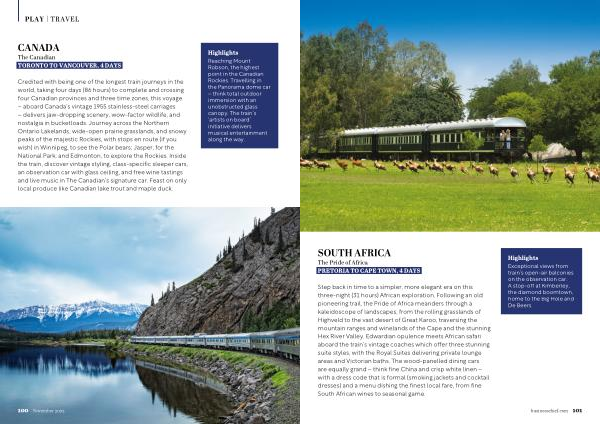 Credited with being one of the longest train journeys in the world , taking four days ( 86 hours ) to complete and crossing four Canadian provinces and three time zones , this voyage – aboard Canada ’ s vintage 1955 stainless-steel carriages – delivers jaw-dropping scenery , wow-factor wildlife , and nostalgia in bucketloads . Journey across the Northern Ontario Lakelands , wide-open prairie grasslands , and snowy peaks of the majestic Rockies , with stops en route ( if you wish ) in Winnipeg , to see the Polar bears ; Jasper , for the National Park ; and Edmonton , to explore the Rockies . Inside the train , discover vintage styling , class-specific sleeper cars , an observation car with glass ceiling , and free wine tastings and live music in The Canadian ’ s signature car . Feast on only local produce like Canadian lake trout and maple duck .