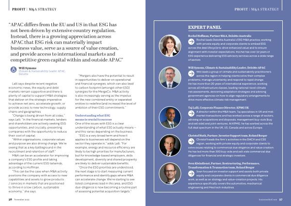 “ Once the ESG priorities are understood , the next stage is to start measuring current performance and identify gaps where M & A can accelerate change . We ’ re starting to see listed companies lead in this area , and ESG due-diligence is now becoming a routine part of assessing potential acquisition targets .”