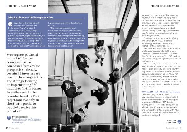 Partner of the Restructuring , Performance , Transformation & Transaction team at Roland Berger , add-on acquisitions for geographical or product expansion , digitalisation and cycle resilience are seen as the most important factors for M & A . But ESG is expected to become just as important for M & A in the coming five years , as ESG will be one of the key market drivers next to digitalization , he says .