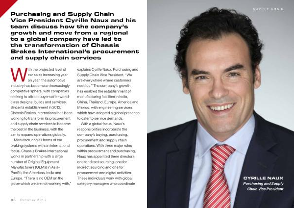 Purchasing and Supply Chain Vice President Cyrille Naux and his team discuss how the company ’ s growth and move from a regional to a global company have led to the transformation of Chassis Brakes International ’ s procurement and supply chain services