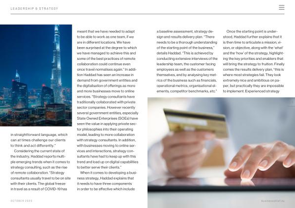 Considering the current state of the industry , Haddad reports multiple emerging trends when it comes to strategy consulting , such as the rise of remote collaboration . “ Strategy consultants usually travel to be on site with their clients . The global freeze in travel as a result of COVID-19 has meant that we have needed to adapt to be able to work as one team , if we are in different locations . We have been surprised at the degree to which we have managed to achieve this and some of the best practices of remote collaboration could continue even once travel normalises again .” In addition Haddad has seen an increase in demand from government entities and the digitalisation of offerings as more and more businesses move to online services . “ Strategy consultants have traditionally collaborated with private sector companies . However recently several government entities , especially State Owned Enterprises ( SOEs ) have seen the value in applying private sector philosophies into their operating model , leading to more collaboration with strategy consultants . In addition , with businesses moving to online services and interactions , strategy consultants have had to keep up with this trend and load up on digital capabilities to better serve their clients .”