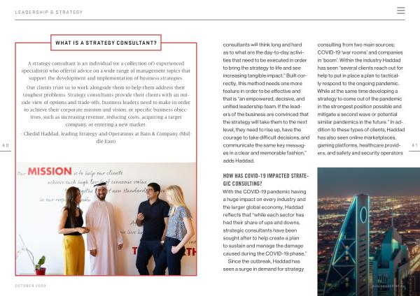 consultants will think long and hard as to what are the day-to-day activities that need to be executed in order to bring the strategy to life and see increasing tangible impact .” Built correctly , this method needs one more feature in order to be effective and that is “ an empowered , decisive , and unified leadership team . If the leaders of the business are convinced that the strategy will take them to the next level , they need to rise up , have the courage to take difficult decisions , and communicate the same key messages in a clear and memorable fashion ,” adds Haddad . consulting from two main sources : COVID-19 ‘ war rooms ’ and companies in ‘ boom ’. Within the industry Haddad has seen “ several clients reach out for help to put in place a plan to tactically respond to the ongoing pandemic . While at the same time developing a strategy to come out of the pandemic in the strongest position possible and mitigate a second wave or potential similar pandemics in the future .” In addition to these types of clients , Haddad has also seen online marketplaces , gaming platforms , healthcare providers , and safety and security operators