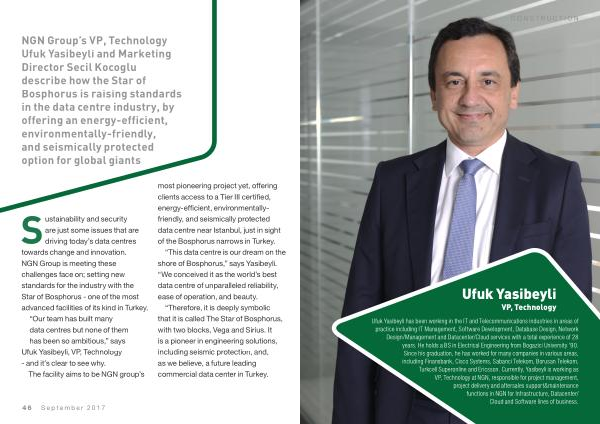 Sustainability and security are just some issues that are driving today ’ s data centres towards change and innovation . NGN Group is meeting these challenges face on ; setting new standards for the industry with the Star of Bosphorus - one of the most advanced facilities of its kind in Turkey . “ Our team has built many data centres but none of them has been so ambitious ,” says Ufuk Yasibeyli , VP , Technology - and it ’ s clear to see why .
