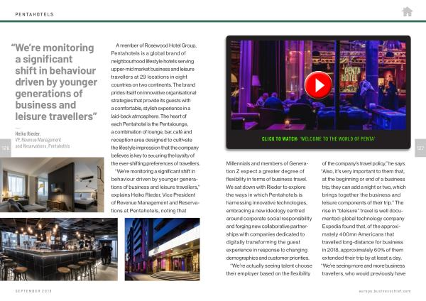 Millennials and members of Generation Z expect a greater degree of flexibility in terms of business travel . We sat down with Rieder to explore the ways in which Pentahotels is harnessing innovative technologies , embracing a new ideology centred around corporate social responsibility and forging new collaborative partnerships with companies dedicated to digitally transforming the guest experience in response to changing demographics and customer priorities .