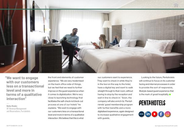 — Heiko Rieder , VP , Revenue Management and Reservations , Pentahotels the front end elements of customer experience . “ We are very modernised on the back office side of things , but we feel that we need to further improve on the guest experience when it comes to digitalization . We ’ re very close to launching technology that facilitates the self-check-in / check-out process at one of our hotels ” he explains . “ We want to engage with our customers less on a transactional level and more in terms of a qualitative interaction . We believe that this is what