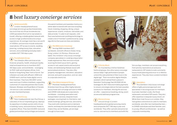 Quintessentially London-headquartered luxury concierge services group Quintessentially has more than 60 offices worldwide and 1,500 specialists ( from art to real estate to travel ), offering a reliable global network with access to high-profile brands and unique experiences . An average client has a net worth of US $ 36m , and services include restaurant reservations , VIP access to events , wedding planning , curating luxury trips , relocation services , and undertaking everyday tasks – available 24 / 7 , 365 days a year .