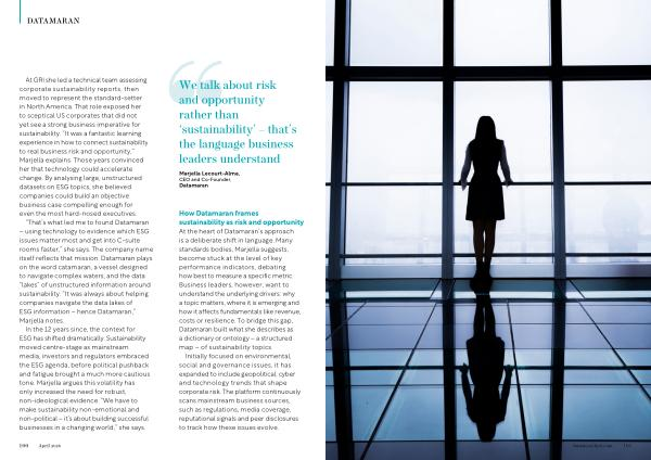 How Datamaran frames sustainability as risk and opportunity At the heart of Datamaran’ s approach is a deliberate shift in language. Many standards bodies, Marjella suggests, become stuck at the level of key performance indicators, debating how best to measure a specific metric. Business leaders, however, want to understand the underlying drivers: why a topic matters, where it is emerging and how it affects fundamentals like revenue, costs or resilience. To bridge this gap, Datamaran built what she describes as a dictionary or ontology – a structured map – of sustainability topics.