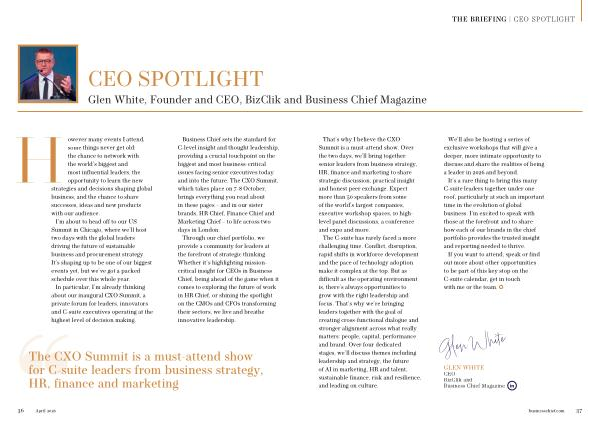 Business Chief sets the standard for C-level insight and thought leadership, providing a crucial touchpoint on the biggest and most business-critical issues facing senior executives today and into the future. The CXO Summit, which takes place on 7-8 October, brings everything you read about in these pages – and in our sister brands, HR Chief, Finance Chief and Marketing Chief – to life across two days in London. Through our chief portfolio, we provide a community for leaders at the forefront of strategic thinking. Whether it’ s highlighting missioncritical insight for CEOs in Business Chief, being ahead of the game when it comes to exploring the future of work in HR Chief, or shining the spotlight on the CMOs and CFOs transforming their sectors, we live and breathe innovative leadership.