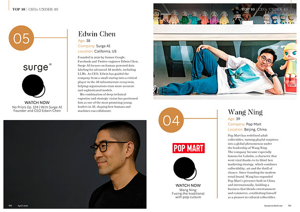 Founded in 2020 by former Google, Facebook and Twitter engineer Edwin Chen, Surge AI focuses on human-powered data labeling for advanced AI models, including LLMs. As CEO, Edwin has guided the company from a small startup into a critical player in the AI infrastructure ecosystem, helping organisations train more accurate and sophisticated models. His combination of deep technical expertise and strategic vision has positioned him as one of the most promising young leaders in AI, shaping how humans and machines can collaborate. 60 April 2026