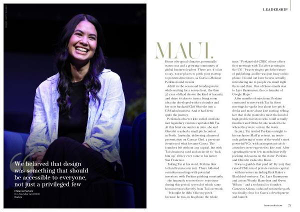 Home of tropical climates, perennially warm seas and a growing community of global business leaders. There are, it’ s fair to say, worse places to pitch your startup to potential investors, as Canva’ s Melanie Perkins found in 2012. Adrift in the ocean and treading water while waiting for a rescue boat, the then 25-year-old had shown the kind of tenacity and drive it takes to turn a living room idea she developed with co-founder and her now husband Cliff Obrecht into a US $ 42bn business. And it had been quite the journey. Perkins had never kite surfed until she met legendary venture capitalist Bill Tai. At this brief encounter in 2010, she and Obrecht crashed a small pitch contest in Perth, Australia, delivering a hurried presentation on Canvas Chef, a previous iteration of what became Canva. The founders left without any capital, but with Tai’ s business card and an invite to“ look him up” if they ever came to his native San Francisco. Taking Tai at his word, Perkins flew to San Francisco in 2011. There followed countless meetings with potential investors, with Perkins pitching constantly – she famously received 100 + rejections during this period, several of which came from investors directly from Tai’ s network.“ I thought he didn’ t like my pitch because he was on his phone the whole time,” Perkins told CNBC of one of her first meetings with Tai after arriving in the US.“ I was trying to pitch the future of publishing, and he was just busy on his phone. I found out later he was actually introducing me to people via email right there and then. One of those emails was to Lars Rasmussen, the co-founder of Google Maps.” After months of rejections, Perkins continued to meet with Tai. In these meetings he spoke less about her pitch decks and more about kite surfing, telling her that if she wanted to meet the kind of high-profile investors who could actually fund her and Obrecht, she needed to be where they were: out on the water. In 2012, Tai invited Perkins outright to his exclusive MaiTai retreat, an inviteonly gathering of some of the world’ s most powerful VCs, with an important catch – attendees were expected to kite surf. After spending the next few months hurriedly packing in lessons on the water, Perkins and Obrecht rushed to Maui. It was a gamble that paid off. By 2013 they raised US $ 1.6m of private venture capital – with investors including Rick Baker’ s Blackbird ventures, Tai, Lars Rasmussen and actors Woody Harrelson and Owen Wilson – and a technical co-founder, Cameron Adams, onboard, meant the path was finally clear for Canva’ s development and launch. businesschief. com