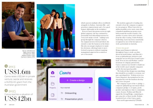 LEADERSHIP which operates multiple offices worldwide alongside its Sydney, Australia HQ – and prioritises empowerment and a‘ be a good human’ philosophy in the workplace. Even as Canva has grown across its eight global campuses, she has continued to personally lead onboarding sessions for every new intake of staff – walking each group through the company’ s history, the original investor deck and where she intends to take the business in the future. She also encourages employees to make key decisions, allowing teams to move forward on projects without requiring management approval for as much as 90 % of decisions.