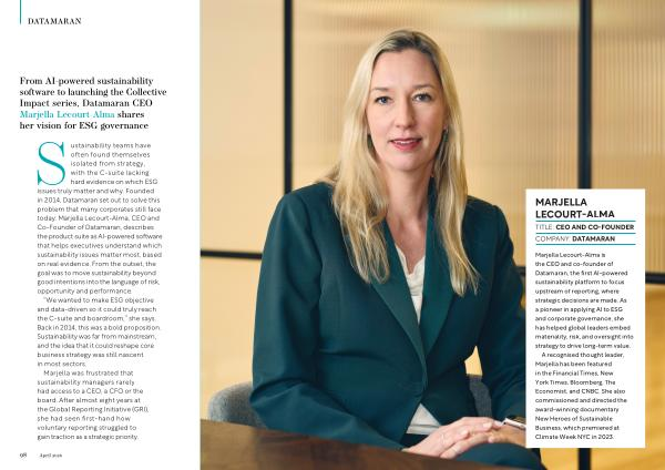From AI-powered sustainability software to launching the Collective Impact series, Datamaran CEO Marjella Lecourt-Alma shares her vision for ESG governance