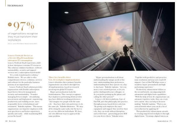 Lenovo TruScale DaaS solution provides organisations with flexible subscriptionbased device lifecycle management, security and sustainability.“ It makes managing devices simple – streamlining procurement and deployment, empowering productivity and enabling secure, more responsible device refurbishment and retirement,” Rakshit explains.“ This means organisations can empower employees with next-gen devices and better experiences quickly and easily – while maximising ROI across the board.”