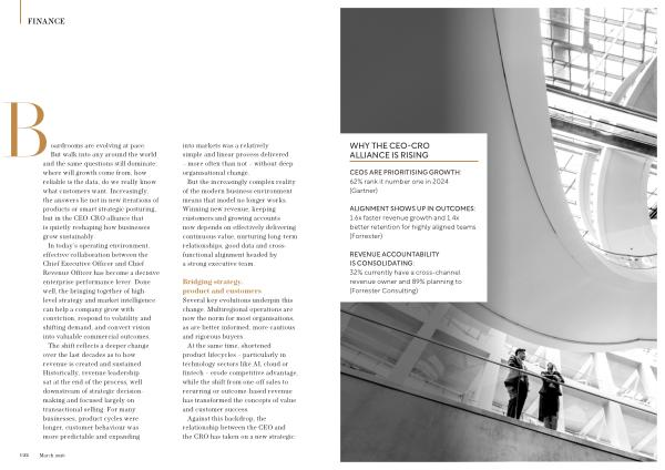 But walk into any around the world and the same questions still dominate: where will growth come from, how reliable is the data, do we really know what customers want. Increasingly, the answers lie not in new iterations of products or smart strategic posturing, but in the CEO-CRO alliance that is quietly reshaping how businesses grow sustainably. In today’ s operating environment, effective collaboration between the Chief Executive Officer and Chief Revenue Officer has become a decisive enterprise performance lever. Done well, the bringing together of highlevel strategy and market intelligence can help a company grow with conviction, respond to volatility and shifting demand, and convert vision into valuable commercial outcomes. The shift reflects a deeper change over the last decades as to how revenue is created and sustained. Historically, revenue leadership sat at the end of the process, well downstream of strategic decisionmaking and focused largely on transactional selling. For many businesses, product cycles were longer, customer behaviour was more predictable and expanding into markets was a relatively simple and linear process delivered – more often than not – without deep organisational change. But the increasingly complex reality of the modern business environment means that model no longer works. Winning new revenue, keeping customers and growing accounts now depends on effectively delivering continuous value, nurturing long-term relationships, good data and crossfunctional alignment headed by a strong executive team.