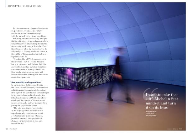 Sustainability and aquaculture In partnership with Kvorning Design, the Eides created Salmon Eye to host tours, exhibitions and cinematic art shows that shed light on the possibilities and challenges facing aquaculture and food production. Sebastian Torjusen, CEO of Salmon Eye, developed the concept of the restaurant in 2021, with Anika and her husband Nico joining the project in late 2022.