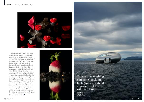 Iris’ s menu – kept under wraps by Anika and the team – encourages a more considered approach to what we eat.“ Our dishes can be provoking,” she says,“ but that’ s really important. I want to take that stiff, Michelin Star mindset and turn it on its head, bring people down to where they’ re comfortable and feel responsible for what they’ re eating. It’ s all about challenges, flavours and possibilities.”