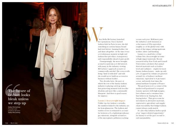 SUSTAINABILITY hen Stella McCartney launched her eponymous, Gucci-backed fashion label in Paris in 2001, she did something no serious luxury brand had tried before: banning leather, fur and skins altogether. At the time it was a revolutionary moment in high-end fashion that put ethics, transparency and responsibility ahead of pure profit.